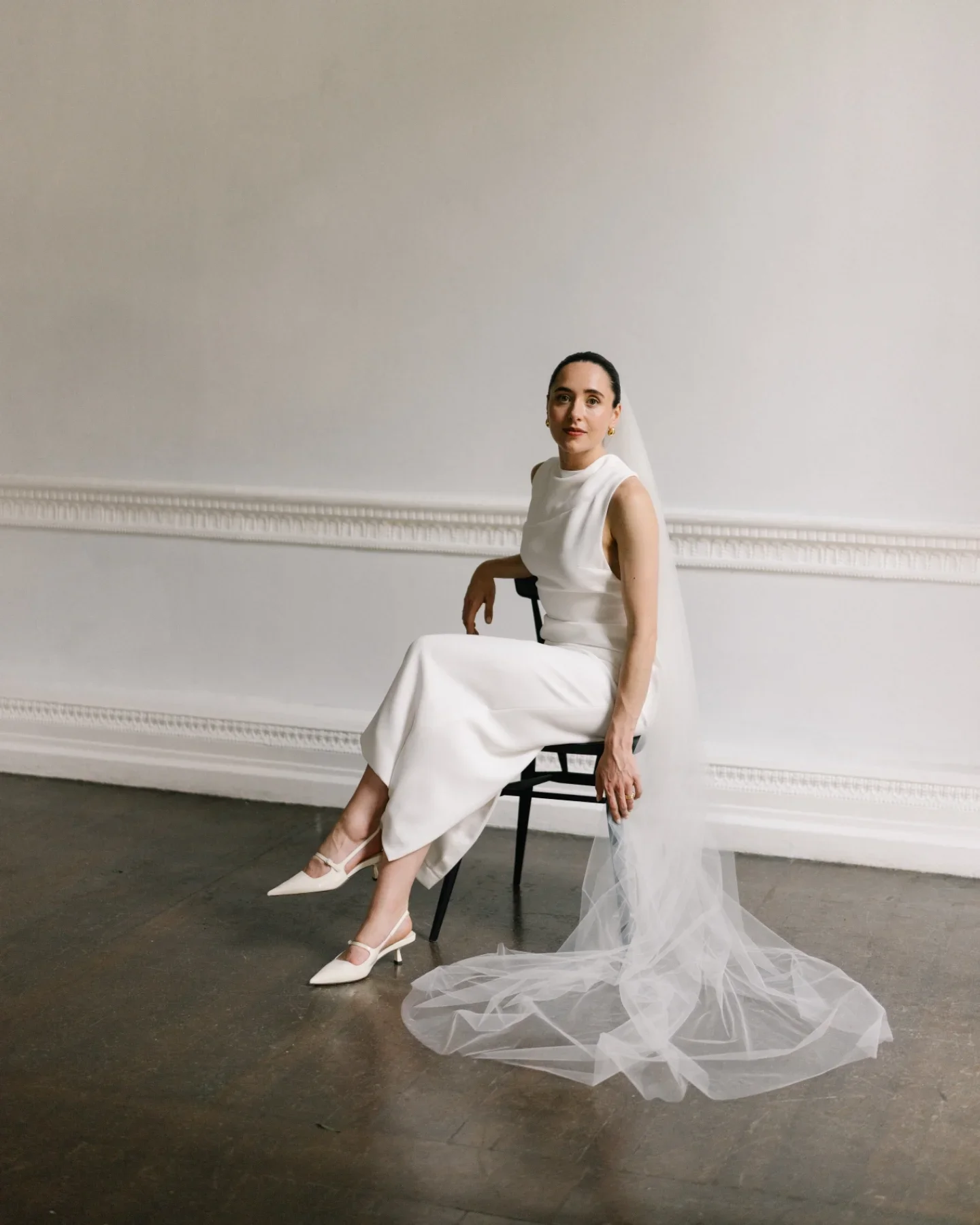 We created a gown with deep scooped side and open back, leaving a column like front with a dramatic back