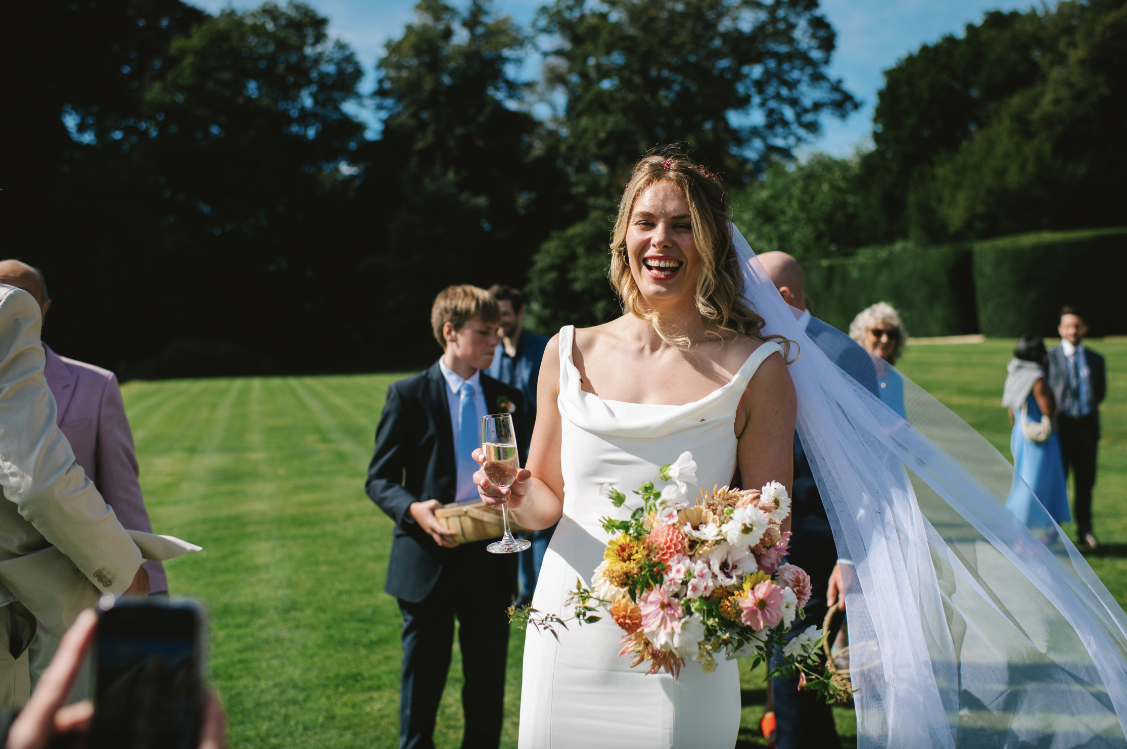 Bespoke crepe wedding dress with a draped neckline, interal corset, godet skirt and button detailing.